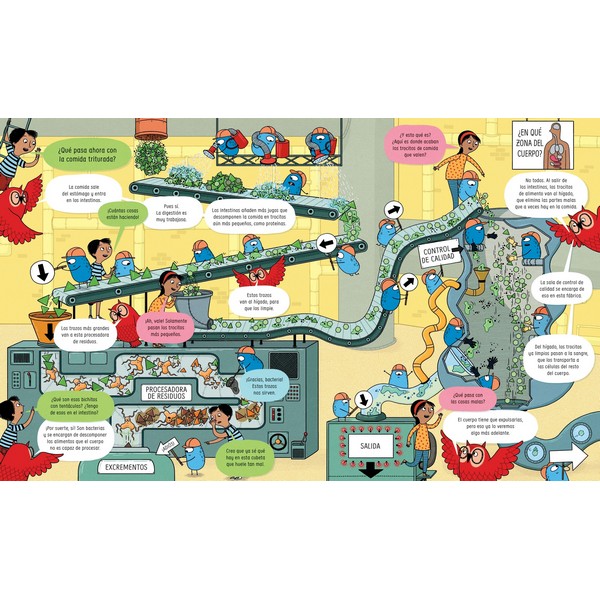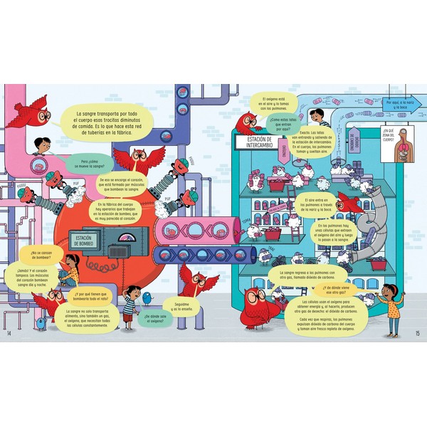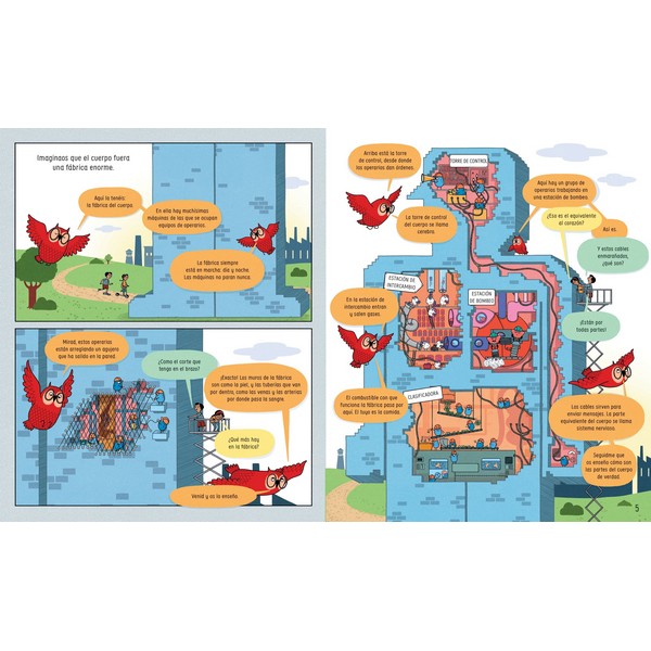 Un aventura al interior del cuerpo humano con coloridas ilustraciones y divertidas analogías que ayudan a entender complejos procesos. De la mano del profesor búho dos niños de adentrarán en el cuerpo humano que, esta ocasión, está representado como una enorme fábrica operada por equipos y máquinas y organizada en bloques o departamentos de producción, desde obreros que reparan muros hasta cintas transportadoras que llevan paquetes de energía vital o defensores para repeler los ataques de gérmenes.