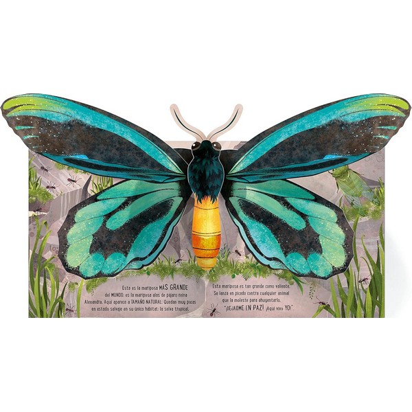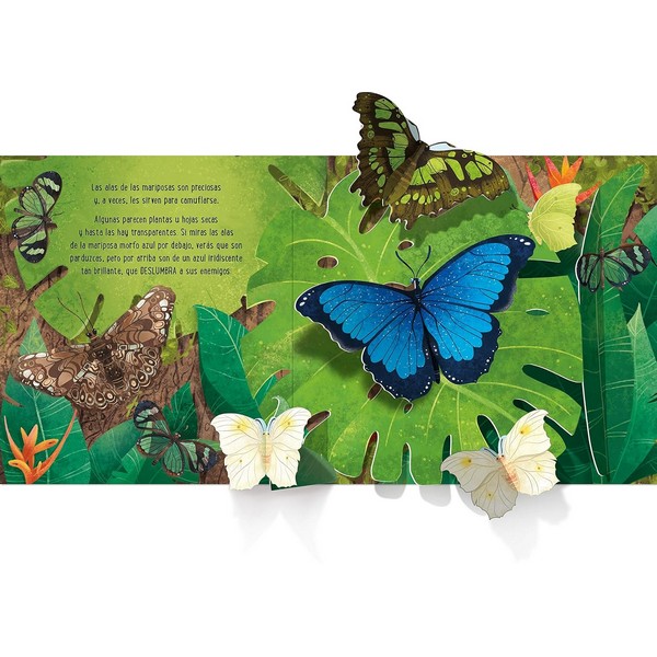 Libro con desplegables sobre el fascinante mundo de las mariposas, que mueven sus alas, emergen de la crisálida y se salen de la página en una nube. En este libro interactivo los pequeños lectores también descubrirán cómo usan sus alas para esconderse y protegerse de los depredadores y cómo funciona el proceso de metamorfosis, que las transforma de oruga a mariposa. Además, el libro incluye la mariposa más grande del mundo en tamaño real.